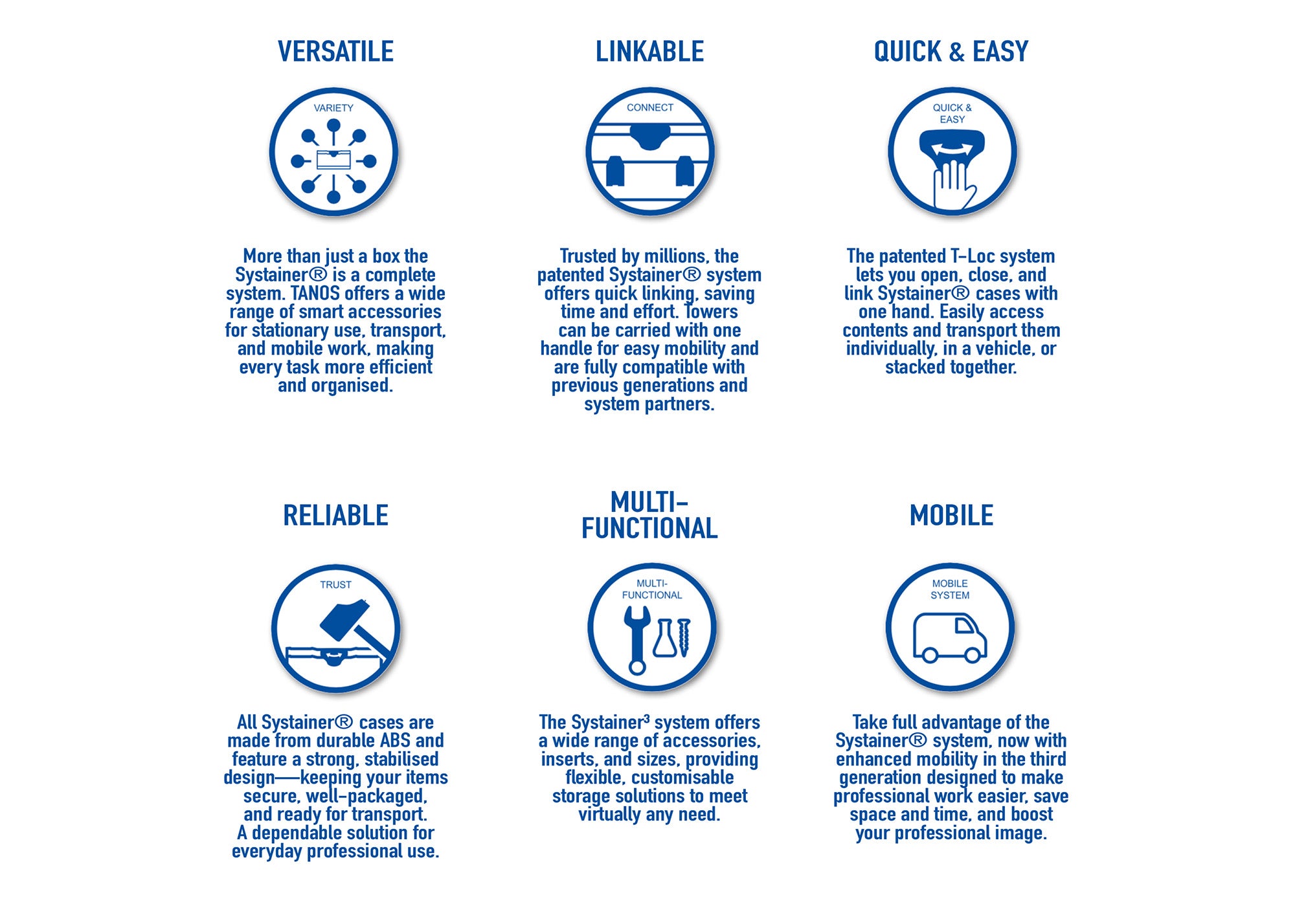 Explore our full range of original Tanos Systainers, proudly engineered in Germany and trusted worldwide. With stackable designs, custom inserts, and robust build quality, the Systainer system brings order to the chaos of everyday work.